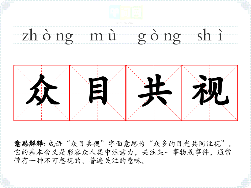 “众目共视”并没有明确的历史典故或文学出处,但可以从字面上理解其构成。成语中的“众目”指的是很多人的眼睛,而“共视”则表示大家一起看或关注。这个成语的构成反映了人们对某一**或现象的广泛关注和重视,常用于描述公众关注的热点问题。