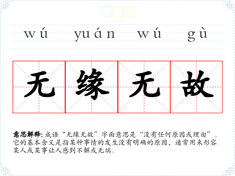 成语“无缘无故”字面意思是“没有任何原因或理由”。它的基本含义是指某种事情的发生没有明确的原因,通常用来形容某人或某事让人感到不解或无端。