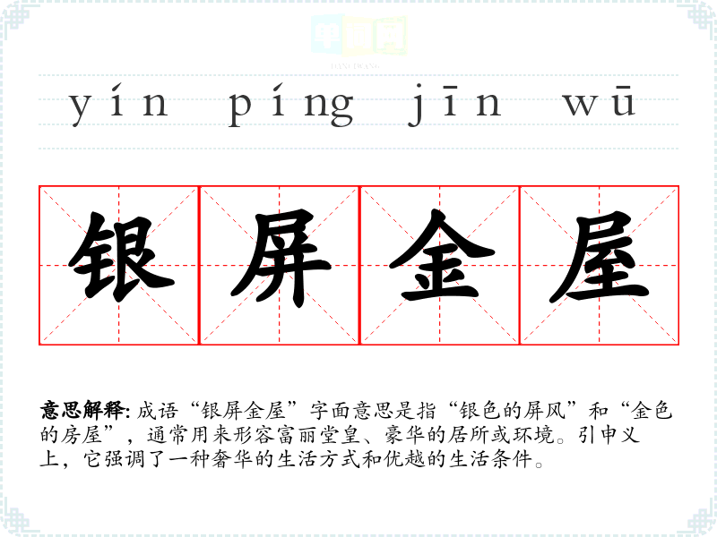 成语“银屏金屋”字面意思是指“银色的屏风”和“金色的房屋”,通常用来形容富丽堂皇、豪华的居所或环境。引申义上,它强调了一种奢华的生活方式和优越的生活条件。