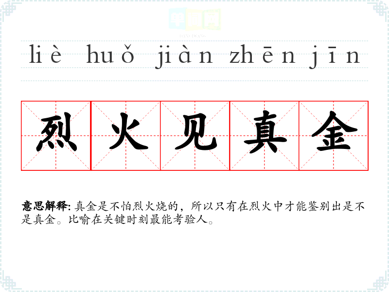 | 烈火真金 | 烈火:熊熊大火,猛烈的火。真金不惧火炼,在烈火中可以鉴别出真正的黄金。 |