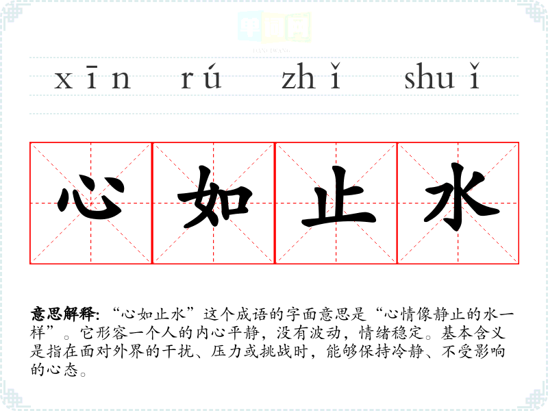“心如止水”这个成语的字面意思是“心情像静止的水一样”。它形容一个人的内心平静,没有波动,情绪稳定。基本含义是指在面对外界的干扰、压力或挑战时,能够保持冷静、不受影响的心态。