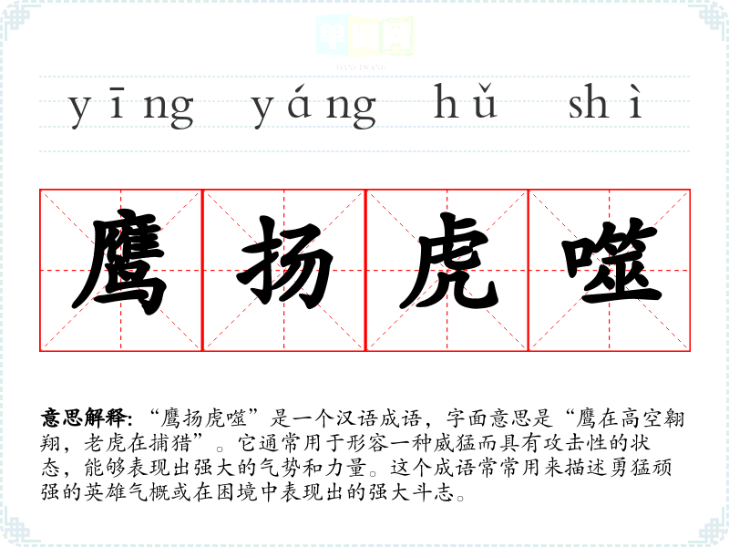 在**传统文化中,鹰和虎都是象征力量和勇气的动物,因此“鹰扬虎噬”在社会中常常被用于激励人心,尤其是在军事、体育和商业竞争等领域。在现代社会,这个成语也适用于描述那些在职场上表现出色、具有强大竞争力的人。
