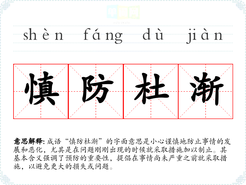 成语“慎防杜渐”的字面意思是小心谨慎地防止事情的发展和恶化,尤其是在问题刚刚出现的时候就采取措施加以制止。其基本含义强调了预防的重要性,提倡在事情尚未严重之前就采取措施,以避免更大的损失或问题。