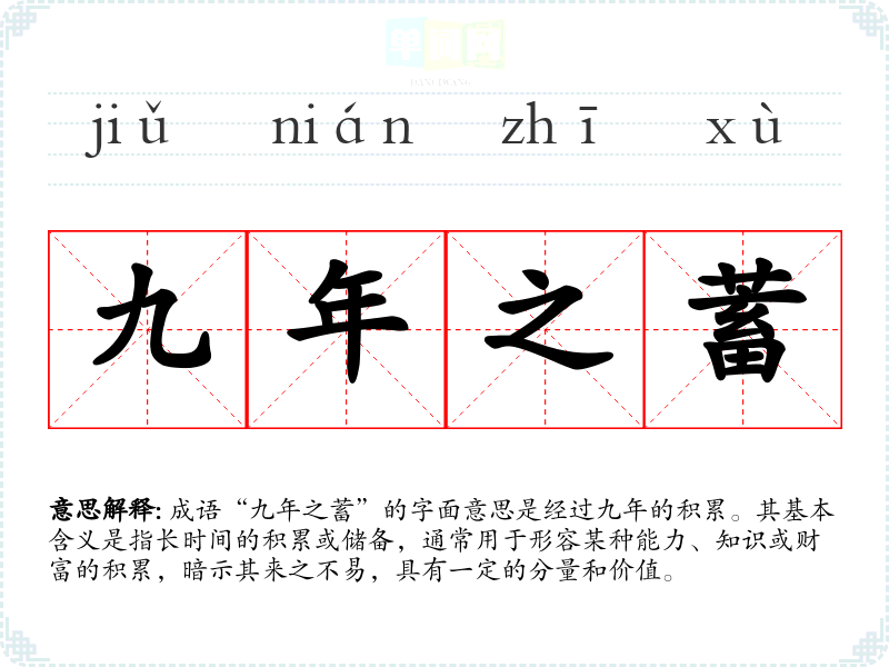 成语“九年之蓄”的字面意思是经过九年的积累。其基本含义是指长时间的积累或储备,通常用于形容某种能力、知识或财富的积累,暗示其来之不易,具有一定的分量和价值。