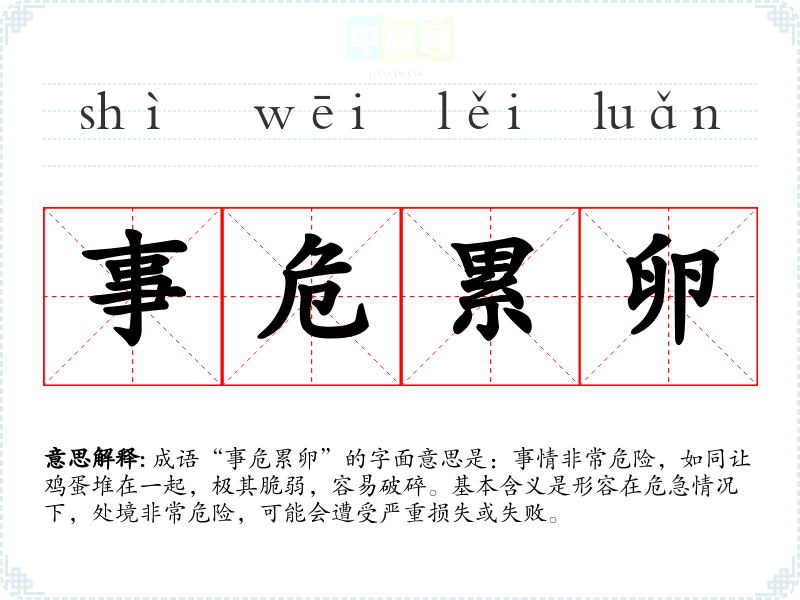 成语“事危累卵”的字面意思是:事情非常危险,如同让鸡蛋堆在一起,极其脆弱,容易破碎。基本含义是形容在危急情况下,处境非常危险,可能会遭受严重损失或失败。