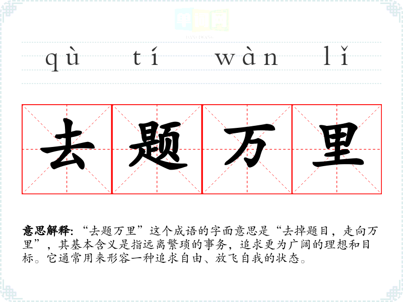 “去题万里”这个成语的字面意思是“去掉题目,走向万里”,其基本含义是指远离繁琐的事务,追求更为广阔的理想和目标。它通常用来形容一种追求自由、放飞自我的状态。