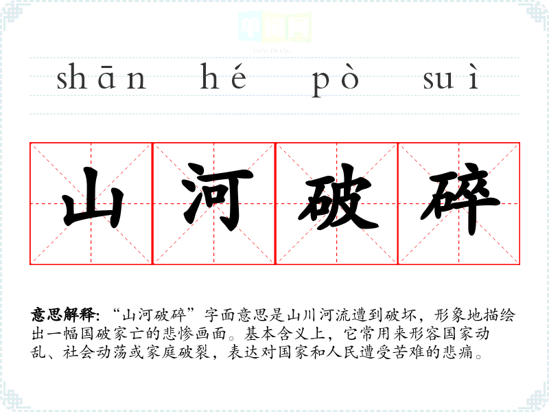 “山河破碎”字面意思是山川河流遭到破坏,形象地描绘出一幅国破家亡的悲惨画面。基本含义上,它常用来形容国家动乱、社会动荡或家庭破裂,表达对国家和人民遭受苦难的悲痛。