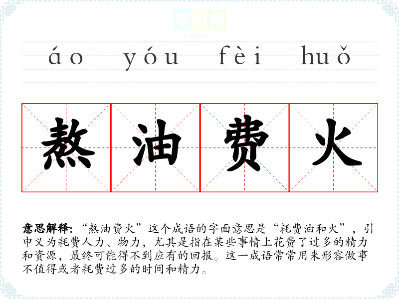 “熬油费火”这个成语的字面意思是“耗费油和火”,引申义为耗费人力、物力,尤其是指在某些事情上花费了过多的精力和资源,最终可能得不到应有的回报。这一成语常常用来形容做事不值得或者耗费过多的时间和精力。