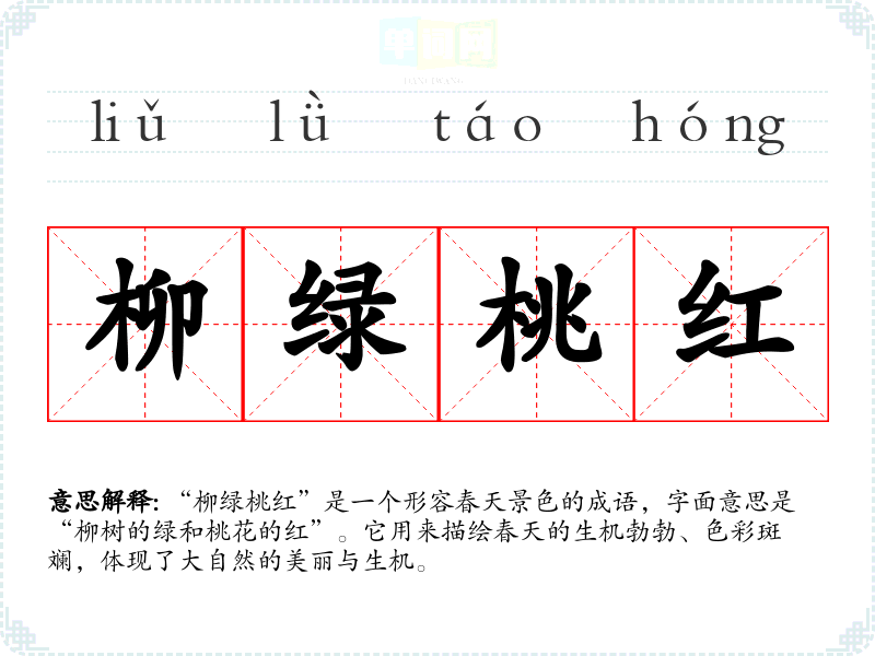 “柳绿桃红”是一个形容春天景色的成语,字面意思是“柳树的绿和桃花的红”。它用来描绘春天的生机勃勃、色彩斑斓,体现了大自然的美丽与生机。
