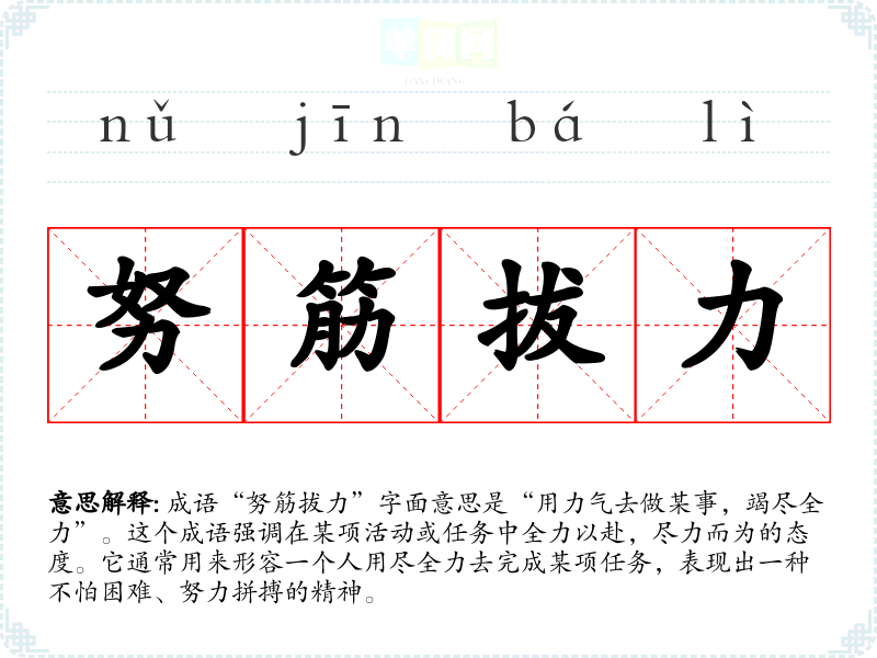 成语“努筋拔力”字面意思是“用力气去做某事,竭尽全力”。这个成语强调在某项活动或任务中全力以赴,尽力而为的态度。它通常用来形容一个人用尽全力去完成某项任务,表现出一种不怕困难、努力拼搏的精神。