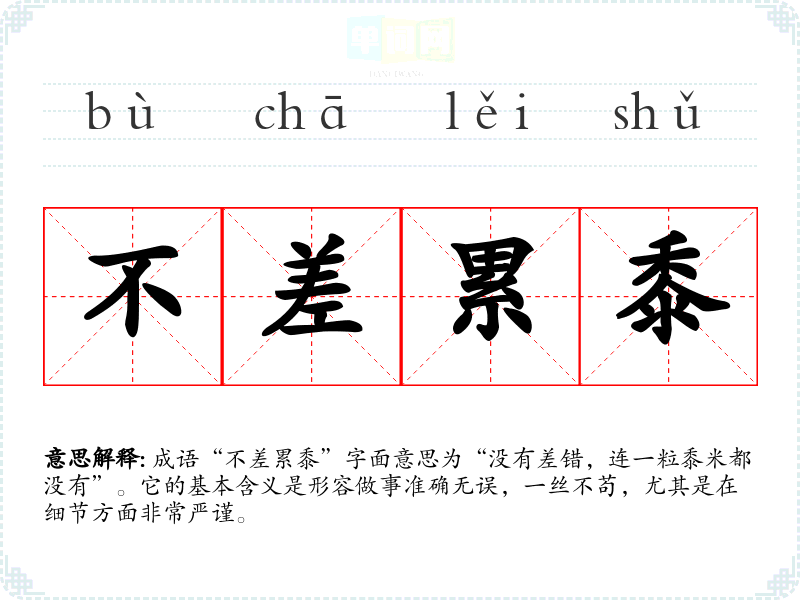 成语“不差累黍”字面意思为“没有差错,连一粒黍米都没有”。它的基本含义是形容做事准确无误,一丝不苟,尤其是在细节方面非常严谨。