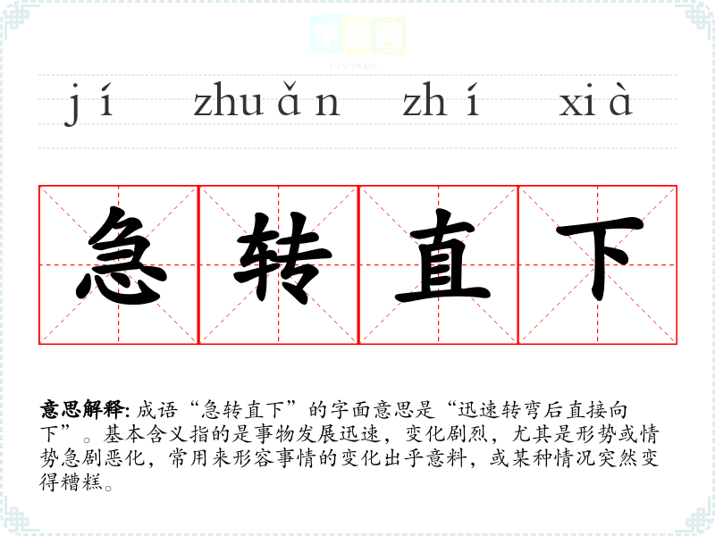 成语“急转直下”的字面意思是“迅速转弯后直接向下”。基本含义指的是事物发展迅速,变化剧烈,尤其是形势或情势急剧恶化,常用来形容事情的变化出乎意料,或某种情况突然变得糟糕。