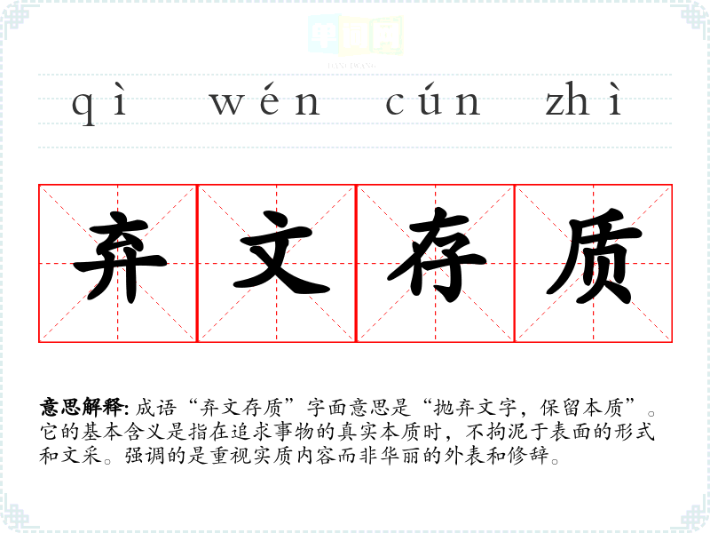 成语“弃文存质”字面意思是“抛弃文字,保留本质”。它的基本含义是指在追求事物的真实本质时,不拘泥于表面的形式和文采。强调的是重视实质内容而非华丽的外表和修辞。