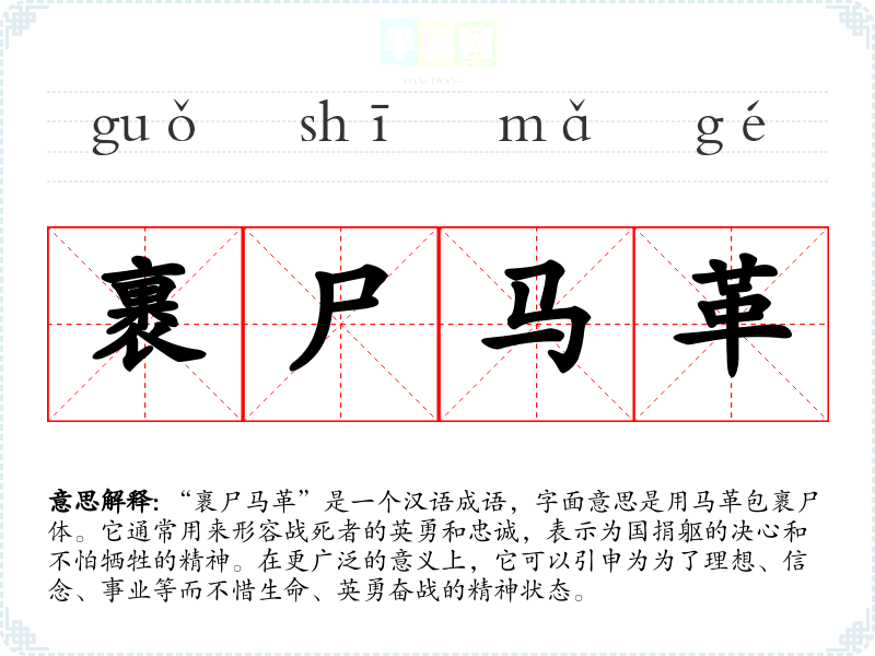 | 裹尸马革 | 革:皮革。用马皮包裹尸体。形容将士战死沙场的英勇无畏的气慨。 |