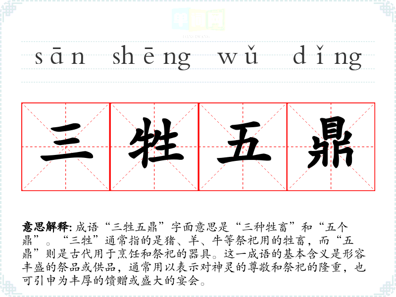 成语“三牲五鼎”字面意思是“三种牲畜”和“五个鼎”。“三牲”通常指的是猪、羊、牛等祭祀用的牲畜,而“五鼎”则是古代用于烹饪和祭祀的器具。这一成语的基本含义是形容丰盛的祭品或供品,通常用以表示对神灵的尊敬和祭祀的隆重,也可引申为丰厚的馈赠或盛大的宴会。