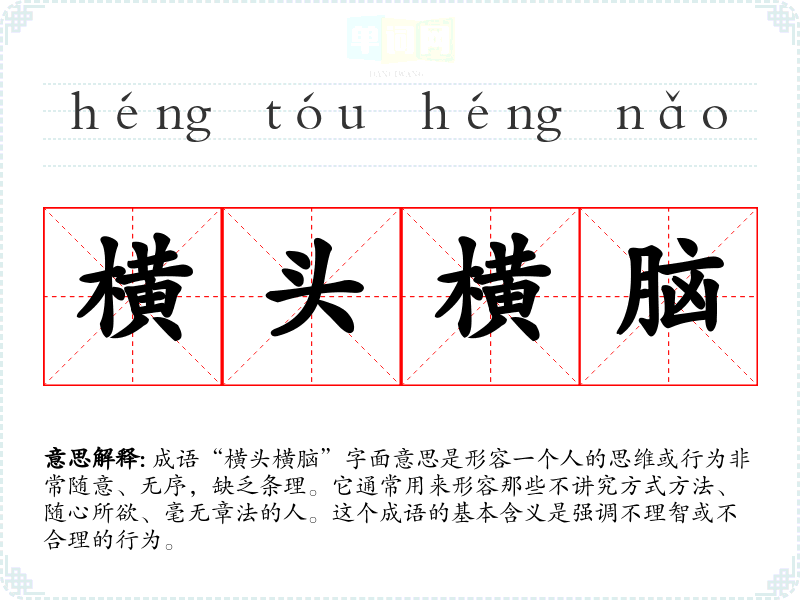 成语“横头横脑”字面意思是形容一个人的思维或行为非常随意、无序,缺乏条理。它通常用来形容那些不讲究方式方法、随心所欲、毫无章法的人。这个成语的基本含义是强调不理智或不合理的行为。