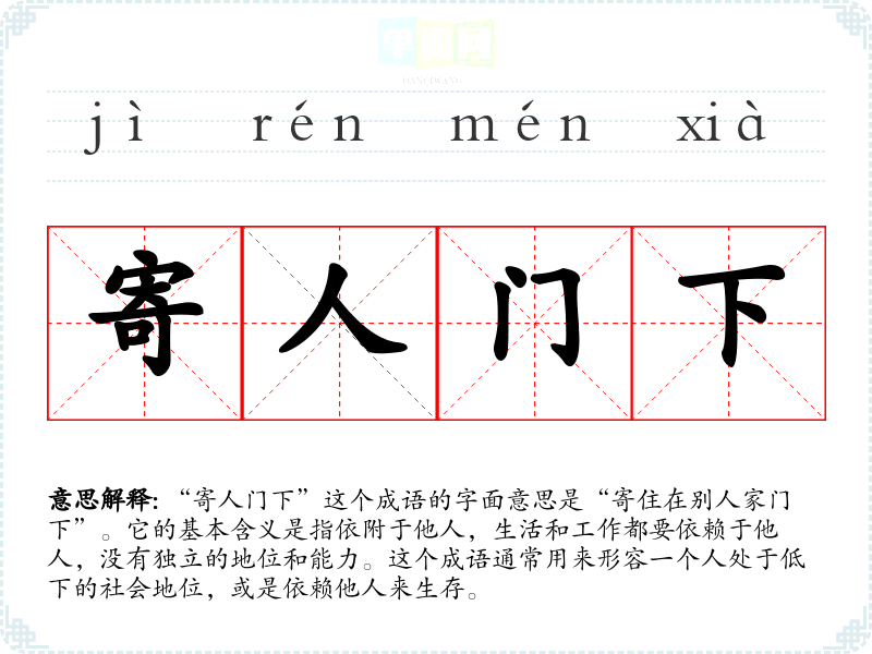 “寄人门下”这个成语的字面意思是“寄住在别人家门下”。它的基本含义是指依附于他人,生活和工作都要依赖于他人,没有独立的地位和能力。这个成语通常用来形容一个人处于低下的社会地位,或是依赖他人来生存。