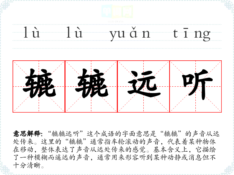 “辘辘远听”这个成语的字面意思是“辘辘”的声音从远处传来。这里的“辘辘”通常指车轮滚动的声音,代表着某种物体在移动,整体表达了声音从远处传来的感觉。基本含义上,它描绘了一种模糊而遥远的声音,通常用来形容听到某种动静或消息但不十分清晰。
