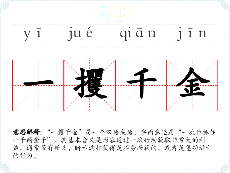 “一攫千金”是一个汉语成语,字面意思是“一次性抓住一千两金子”。其基本含义是形容通过一次行动获取非常大的利益,通常带有贬义,暗示这种获得是不劳而获的,或者是急功近利的行为。