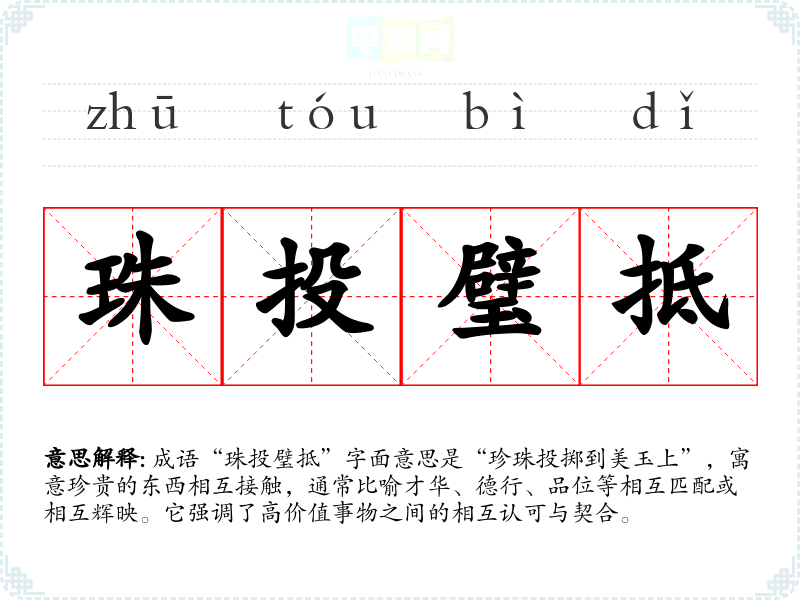 成语“珠投璧抵”字面意思是“珍珠投掷到美玉上”,寓意珍贵的东西相互接触,通常比喻才华、德行、品位等相互匹配或相互辉映。它强调了高价值事物之间的相互认可与契合。