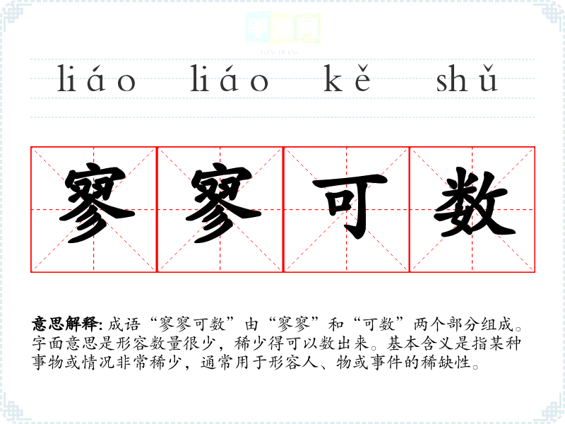 成语“寥寥可数”由“寥寥”和“可数”两个部分组成。字面意思是形容数量很少,稀少得可以数出来。基本含义是指某种事物或情况非常稀少,通常用于形容人、物或**的稀缺性。