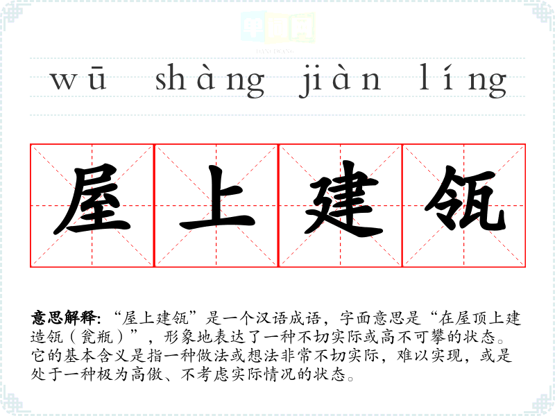 “屋上建瓴”是一个汉语成语,字面意思是“在屋顶上建造瓴(瓮瓶)”,形象地表达了一种不切实际或高不可攀的状态。它的基本含义是指一种做法或想法非常不切实际,难以实现,或是处于一种极为高傲、不考虑实际情况的状态。