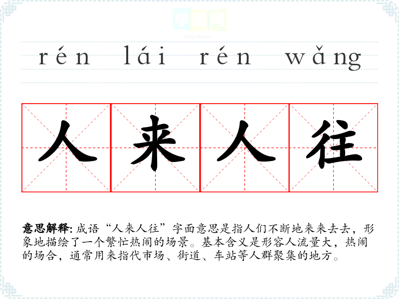 成语“人来人往”字面意思是指人们不断地来来去去,形象地描绘了一个繁忙热闹的场景。基本含义是形容人流量大,热闹的场合,通常用来指代市场、街道、车站等人群聚集的地方。