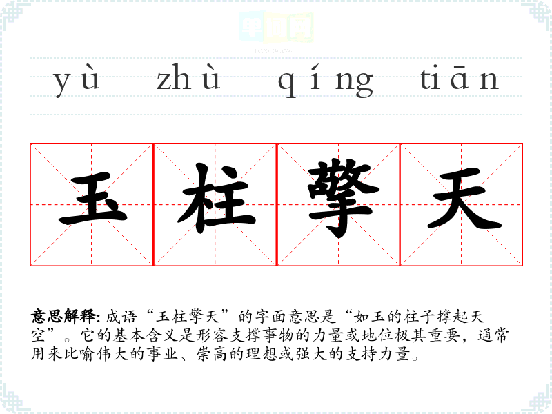成语“玉柱擎天”的字面意思是“如玉的柱子撑起天空”。它的基本含义是形容支撑事物的力量或地位极其重要,通常用来比喻伟大的事业、崇高的理想或强大的支持力量。
