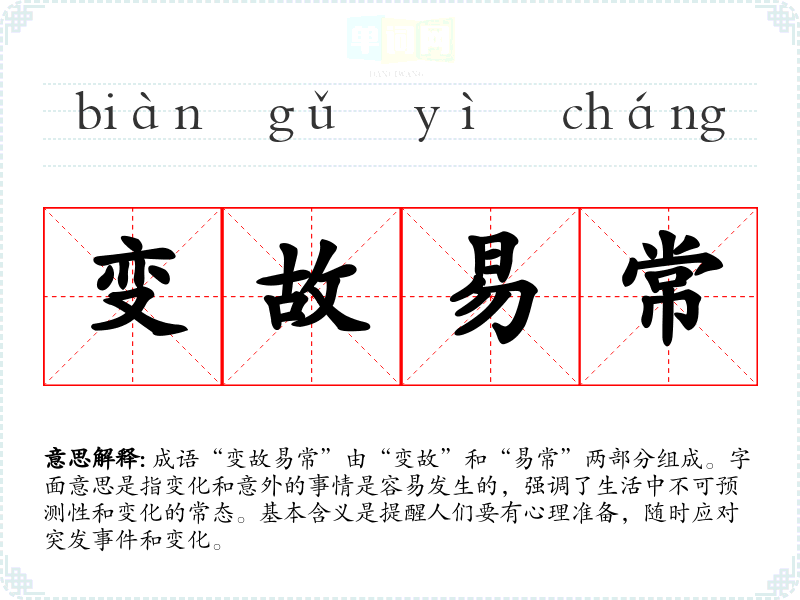 成语“变故易常”由“变故”和“易常”两部分组成。字面意思是指变化和意外的事情是容易发生的,强调了生活中不可预测性和变化的常态。基本含义是提醒人们要有心理准备,随时应对突发**和变化。