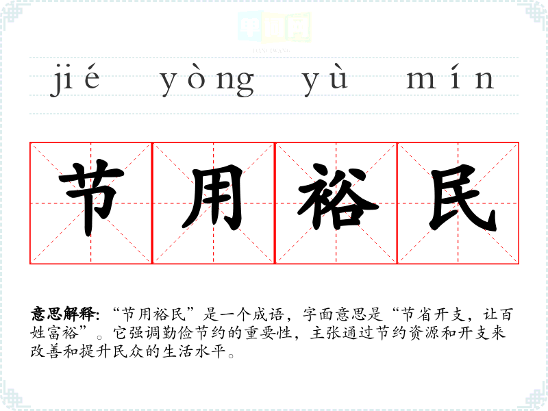 “节用裕民”是一个成语,字面意思是“节省开支,让百姓富裕”。它强调勤俭节约的重要性,主张通过节约资源和开支来改善和提升民众的生活水平。