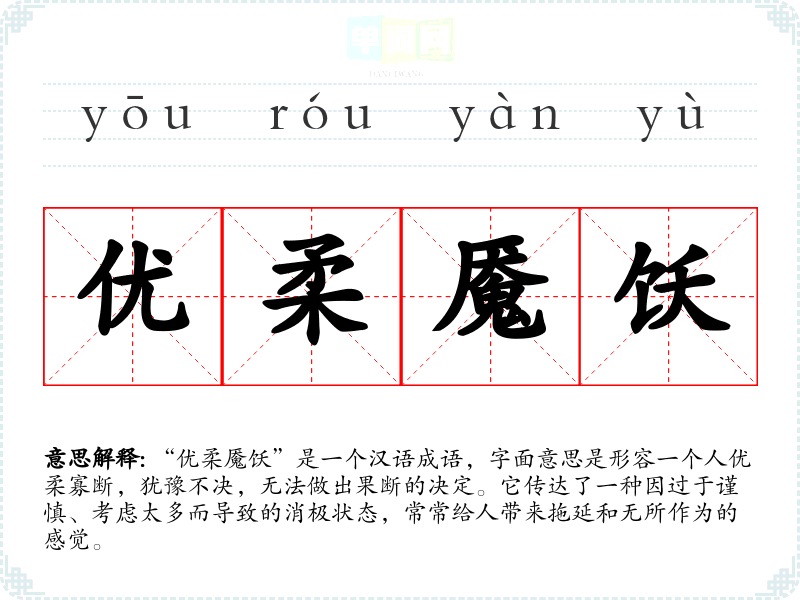 “优柔魇饫”是一个汉语成语,字面意思是形容一个人优柔寡断,犹豫不决,无法做出果断的决定。它传达了一种因过于谨慎、考虑太多而导致的消极状态,常常给人带来拖延和无所作为的感觉。