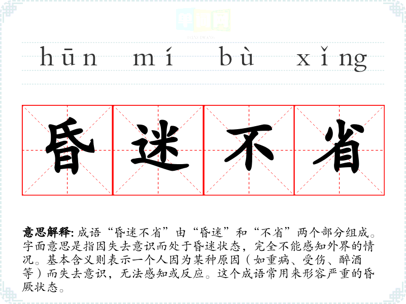 成语“昏迷不省”由“昏迷”和“不省”两个部分组成。字面意思是指因失去意识而处于昏迷状态,完全不能感知外界的情况。基本含义则表示一个人因为某种原因(如重病、受伤、醉酒等)而失去意识,无法感知或反应。这个成语常用来形容严重的昏厥状态。