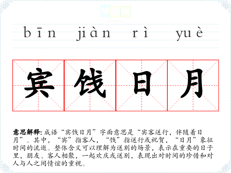 成语“宾饯日月”字面意思是“宾客送行,伴随着日月”。其中,“宾”指客人,“饯”指送行或祝贺,“日月”象征时间的流逝。整体含义可以理解为送别的场景,表示在重要的日子里,朋友、客人相聚,一起欢庆或送别,表现出对时间的珍惜和对人与人之间情谊的重视。