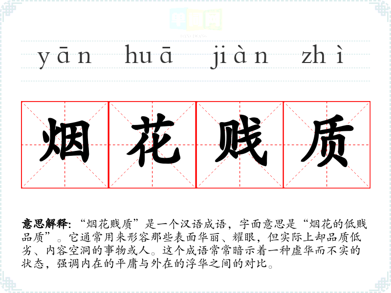“烟花贱质”是一个汉语成语,字面意思是“烟花的低贱品质”。它通常用来形容那些表面华丽、耀眼,但实际上却品质低劣、内容空洞的事物或人。这个成语常常暗示着一种虚华而不实的状态,强调内在的平庸与外在的浮华之间的对比。