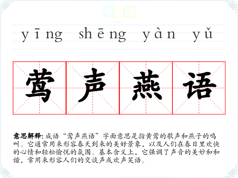 成语“莺声燕语”字面意思是指黄莺的歌声和燕子的鸣叫。它通常用来形容春天到来的美好景象,以及人们在春日里欢快的心情和轻松愉悦的氛围。基本含义上,它强调了声音的美妙和和谐,常用来形容人们的交谈声或欢声笑语。
