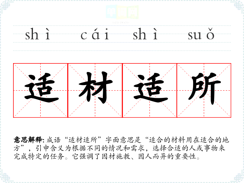 成语“适材适所”字面意思是“适合的材料用在适合的地方”,引申含义为根据不同的情况和需求,选择合适的人或事物来完成特定的任务。它强调了因材施教、因人而异的重要性。