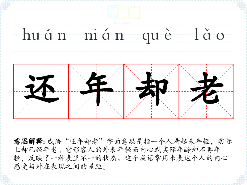 成语“还年却老”字面意思是指一个人看起来年轻,实际上却已经年老。它形容人的外表年轻而内心或实际年龄却不再年轻,反映了一种表里不一的状态。这个成语常用来表达个人的内心感受与外在表现之间的差距。