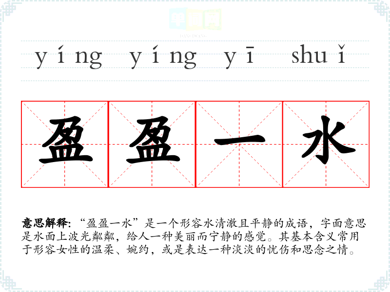 “盈盈一水”是一个形容水清澈且平静的成语,字面意思是水面上波光粼粼,给人一种美丽而宁静的感觉。其基本含义常用于形容女性的温柔、婉约,或是表达一种淡淡的忧伤和思念之情。