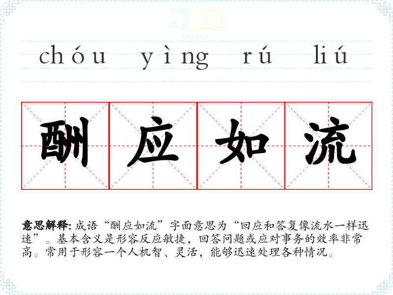 成语“酬应如流”字面意思为“回应和答复像流水一样迅速”。基本含义是形容反应敏捷,回答问题或应对事务的效率非常高。常用于形容一个人机智、灵活,能够迅速处理各种情况。