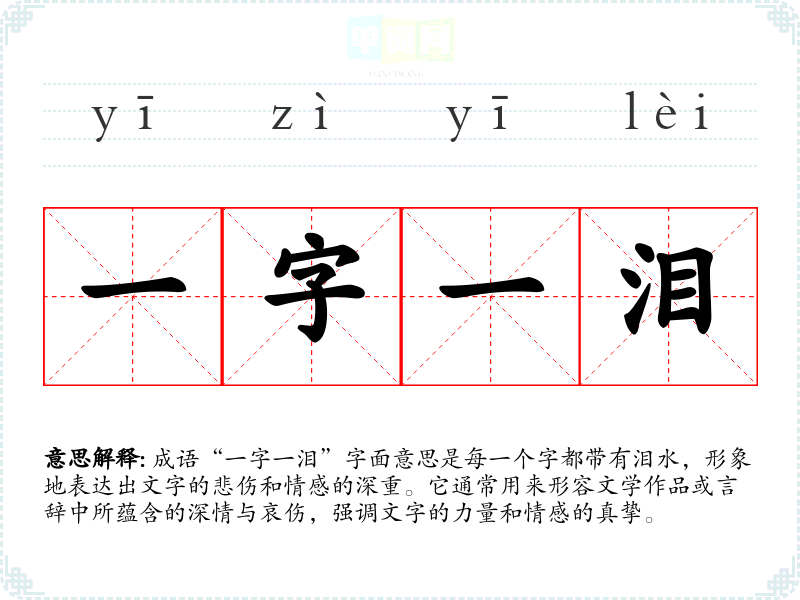 成语“一字一泪”字面意思是每一个字都带有泪水,形象地表达出文字的悲伤和情感的深重。它通常用来形容文学作品或言辞中所蕴含的深情与哀伤,强调文字的力量和情感的真挚。