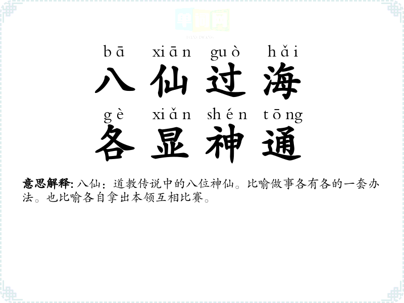 | 八仙过海 | 相传八仙过海时不用舟船,各有一套法术。民间因有“八仙过海,各显神通”的谚语。后以比喻各自拿出本领或办法,互相竞赛。 |