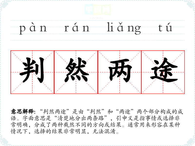 “判然两途”出自《左传》,原文是“君子之行,判然两途”,意指君子在行事时,有清晰的选择方向。这一成语反映了古代对道德判断和选择的重视,体现了君子应有的品德与决断力。