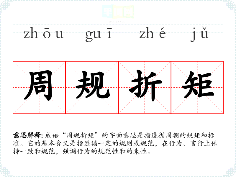 成语“周规折矩”的字面意思是指遵循周朝的规矩和标准。它的基本含义是指遵循一定的规则或规范,在行为、言行上保持一致和规范,强调行为的规范性和约束性。