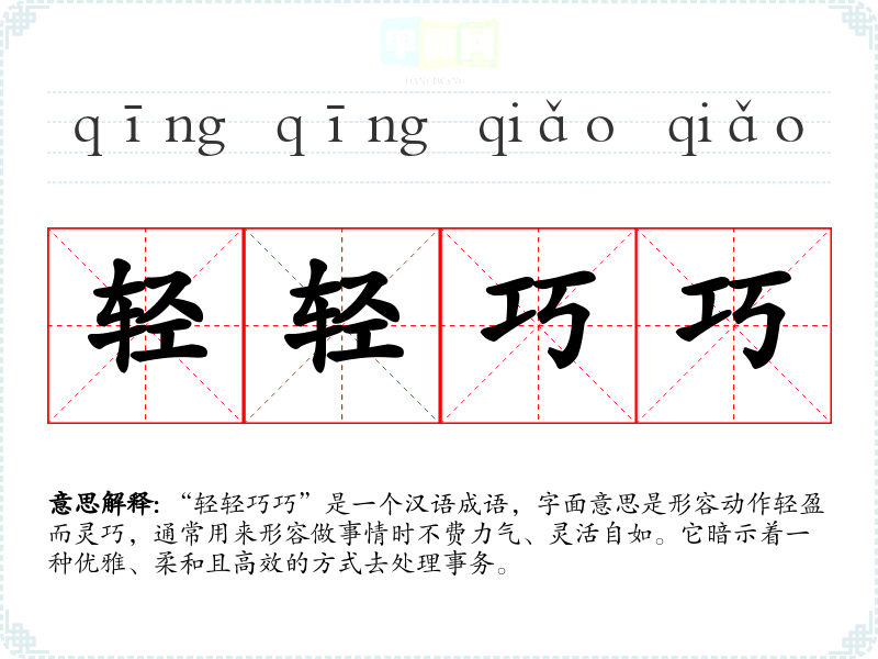 “轻轻巧巧”的确切来源并不明确,但它可以归结为汉字“轻”和“巧”的组合。“轻”表示轻盈、无负担,而“巧”则指灵巧、灵活,常用于描述人的技巧和聪慧。这种组合的成语在古代文学中较为常见,通常用来形容技艺高超或做事情的精细程度。