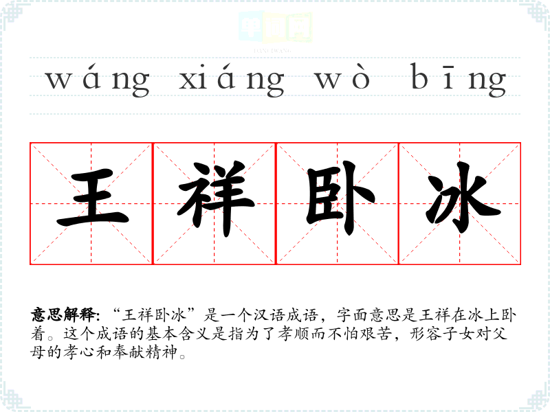 “王祥卧冰”是一个汉语成语,字面意思是王祥在冰上卧着。这个成语的基本含义是指为了孝顺而不怕艰苦,形容子女对父母的孝心和奉献精神。