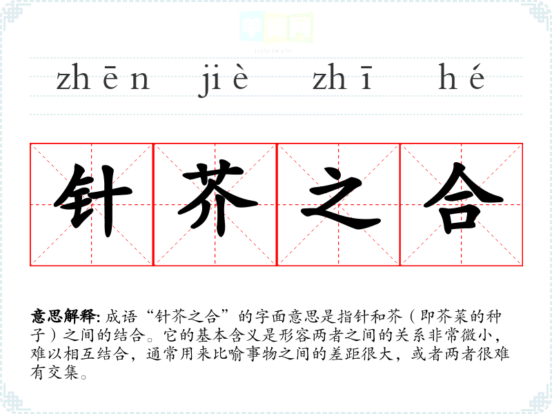 成语“针芥之合”的字面意思是指针和芥(即芥菜的种子)之间的结合。它的基本含义是形容两者之间的关系非常微小,难以相互结合,通常用来比喻事物之间的差距很大,或者两者很难有交集。