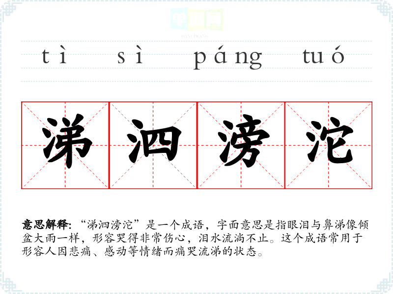 “涕泗滂沱”是一个成语,字面意思是指眼泪与鼻涕像倾盆大雨一样,形容哭得非常伤心,泪水流淌不止。这个成语常用于形容人因悲痛、感动等情绪而痛哭流涕的状态。