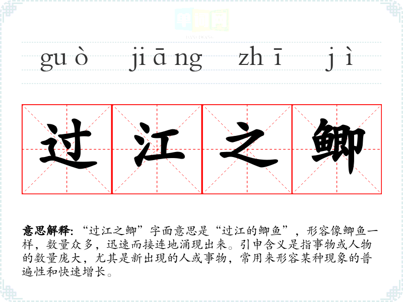 “过江之鲫”字面意思是“过江的鲫鱼”,形容像鲫鱼一样,数量众多,迅速而接连地涌现出来。引申含义是指事物或人物的数量庞大,尤其是新出现的人或事物,常用来形容某种现象的普遍性和快速增长。