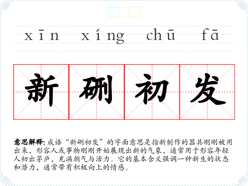 成语“新硎初发”的字面意思是指新制作的器具刚刚被用出来,形容人或事物刚刚开始展现出新的气象,通常用于形容年轻人初出茅庐,充满朝气与活力。它的基本含义强调一种新生的状态和潜力,通常带有积极向上的情感。