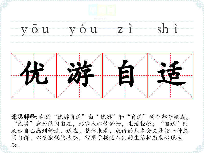成语“优游自适”由“优游”和“自适”两个部分组成。“优游”意为悠闲自在,形容人心情舒畅,生活轻松;“自适”则表示自己感到舒适、适应。整体来看,成语的基本含义是指一种悠闲自得、心情愉悦的状态,常用于描述人们的生活状态或心理状态。